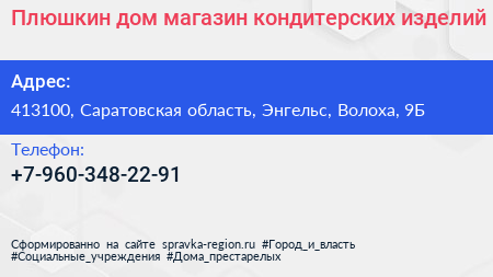Плюшкин дом, магазин кондитерских изделий по адресу 413100, Саратовская область, Энгельс, Волоха, 9Б в дальнейшем Организация, размещена в следующих категориях:
