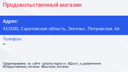 Продовольственный магазин по адресу 413100, Саратовская область, Энгельс, Петровская, 66 в дальнейшем Организация, размещена в следующих категориях: