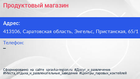 Продуктовый магазин по адресу 413106, Саратовская область, Энгельс, Пристанская, 65/1 в дальнейшем Организация, размещена в следующих категориях: