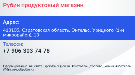 Рубин, продуктовый магазин по адресу 413105, Саратовская область, Энгельс, Урицкого (1-й микрорайон), 13 в дальнейшем Организация, размещена в следующих категориях: