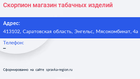 Скорпион, магазин табачных изделий по адресу 413102, Саратовская область, Энгельс, Мясокомбинат, 4а в дальнейшем Организация, размещена в следующих категориях: