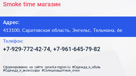 Smoke time, магазин по адресу 413100, Саратовская область, Энгельс, Тельмана, 6е в дальнейшем Организация, размещена в следующих категориях: