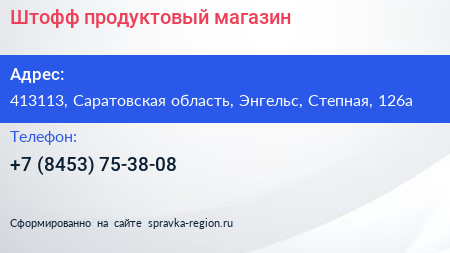 Штофф, продуктовый магазин по адресу 413113, Саратовская область, Энгельс, Степная, 126а в дальнейшем Организация, размещена в следующих категориях: