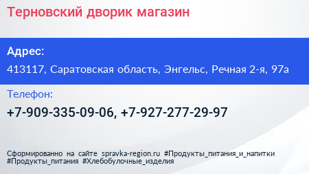 Терновский дворик, магазин по адресу 413117, Саратовская область, Энгельс, Речная 2-я, 97а в дальнейшем Организация, размещена в следующих категориях: