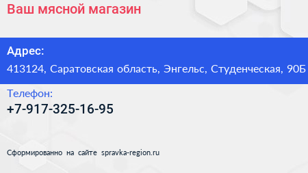 Ваш мясной, магазин по адресу 413124, Саратовская область, Энгельс, Студенческая, 90Б в дальнейшем Организация, размещена в следующих категориях: