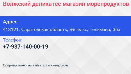 Волжский деликатес, магазин морепродуктов по адресу 413121, Саратовская область, Энгельс, Тельмана, 35а в дальнейшем Организация, размещена в следующих категориях: