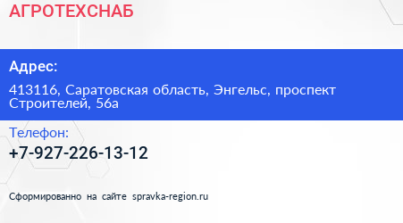АГРОТЕХСНАБ по адресу 413116, Саратовская область, Энгельс, проспект Строителей, 56а в дальнейшем Организация, размещена в следующих категориях: