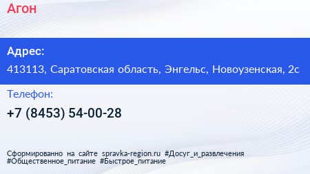 Агон по адресу 413113, Саратовская область, Энгельс, Новоузенская, 2с в дальнейшем Организация, размещена в следующих категориях: