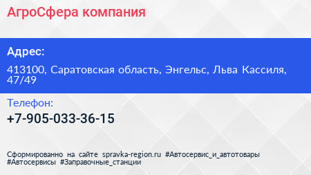 АгроСфера, компания по адресу 413100, Саратовская область, Энгельс, Льва Кассиля, 47/49 в дальнейшем Организация, размещена в следующих категориях: