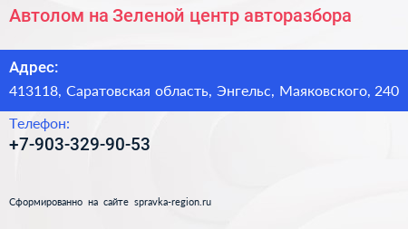 Автолом на Зеленой, центр авторазбора по адресу 413118, Саратовская область, Энгельс, Маяковского, 240 в дальнейшем Организация, размещена в следующих категориях: