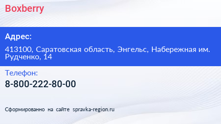 Boxberry по адресу 413100, Саратовская область, Энгельс, Набережная им. Рудченко, 14 в дальнейшем Организация, размещена в следующих категориях: