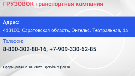ГРУЗОВОК, транспортная компания по адресу 413100, Саратовская область, Энгельс, Театральная, 1а в дальнейшем Организация, размещена в следующих категориях: