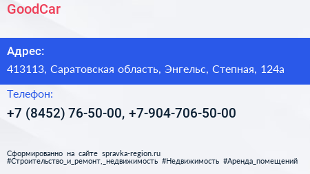 GoodCar по адресу 413113, Саратовская область, Энгельс, Степная, 124а в дальнейшем Организация, размещена в следующих категориях:
