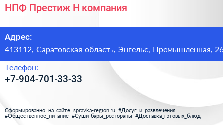 НПФ Престиж-Н, компания по адресу 413112, Саратовская область, Энгельс, Промышленная, 26 в дальнейшем Организация, размещена в следующих категориях: