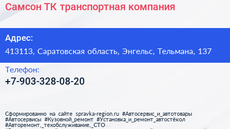 Самсон ТК, транспортная компания по адресу 413113, Саратовская область, Энгельс, Тельмана, 137 в дальнейшем Организация, размещена в следующих категориях: