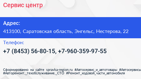 Сервис-центр по адресу 413100, Саратовская область, Энгельс, Нестерова, 22 в дальнейшем Организация, размещена в следующих категориях: