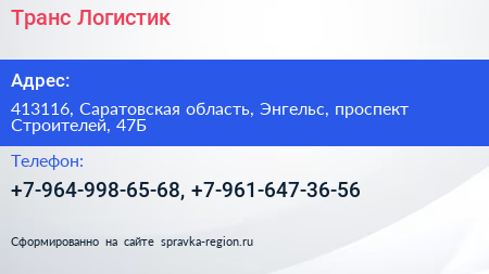 Транс Логистик по адресу 413116, Саратовская область, Энгельс, проспект Строителей, 47Б в дальнейшем Организация, размещена в следующих категориях: