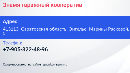 Знамя, гаражный кооператив по адресу 413113, Саратовская область, Энгельс, Марины Расковой, 5 в дальнейшем Организация, размещена в следующих категориях: