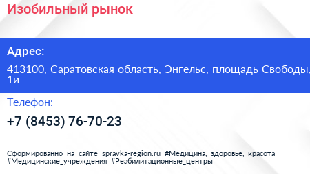 Изобильный, рынок по адресу 413100, Саратовская область, Энгельс, площадь Свободы, 1и в дальнейшем Организация, размещена в следующих категориях: