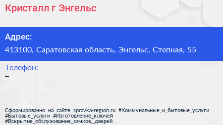 Кристалл, г. Энгельс по адресу 413100, Саратовская область, Энгельс, Степная, 55 в дальнейшем Организация, размещена в следующих категориях: