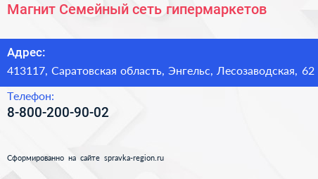 Магнит Семейный, сеть гипермаркетов по адресу 413117, Саратовская область, Энгельс, Лесозаводская, 62 в дальнейшем Организация, размещена в следующих категориях:
