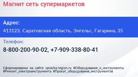 Магнит, сеть супермаркетов по адресу 413123, Саратовская область, Энгельс, Гагарина, 35 в дальнейшем Организация, размещена в следующих категориях: