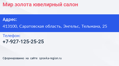 Мир золота, ювелирный салон по адресу 413100, Саратовская область, Энгельс, Тельмана, 25 в дальнейшем Организация, размещена в следующих категориях: