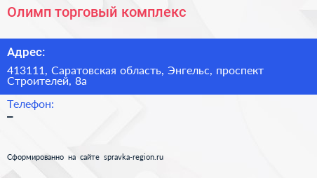 Олимп, торговый комплекс по адресу 413111, Саратовская область, Энгельс, проспект Строителей, 8а в дальнейшем Организация, размещена в следующих категориях: