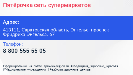 Пятёрочка, сеть супермаркетов по адресу 413111, Саратовская область, Энгельс, проспект Фридриха Энгельса, 67 в дальнейшем Организация, размещена в следующих категориях: