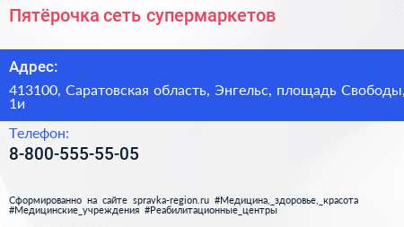 Пятёрочка, сеть супермаркетов по адресу 413100, Саратовская область, Энгельс, площадь Свободы, 1и в дальнейшем Организация, размещена в следующих категориях: