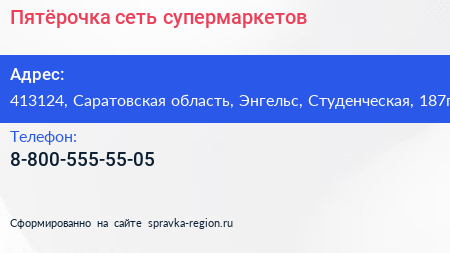 Пятёрочка, сеть супермаркетов по адресу 413124, Саратовская область, Энгельс, Студенческая, 187г в дальнейшем Организация, размещена в следующих категориях: