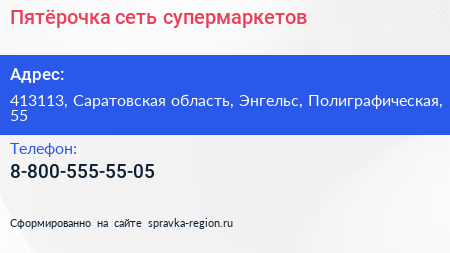 Пятёрочка, сеть супермаркетов по адресу 413113, Саратовская область, Энгельс, Полиграфическая, 55 в дальнейшем Организация, размещена в следующих категориях: