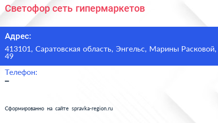 Светофор, сеть гипермаркетов по адресу 413101, Саратовская область, Энгельс, Марины Расковой, 49 в дальнейшем Организация, размещена в следующих категориях: