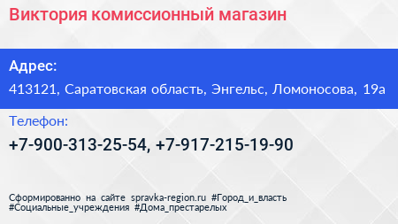 Виктория, комиссионный магазин по адресу 413121, Саратовская область, Энгельс, Ломоносова, 19а в дальнейшем Организация, размещена в следующих категориях: