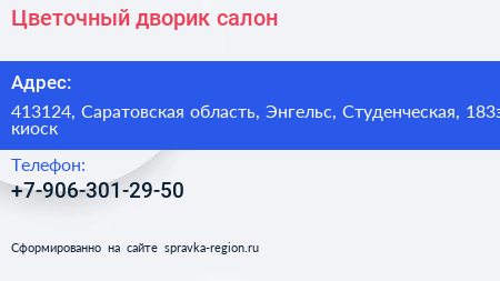 Цветочный дворик, салон по адресу 413124, Саратовская область, Энгельс, Студенческая, 183з киоск в дальнейшем Организация, размещена в следующих категориях: