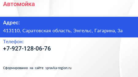 Автомойка по адресу 413110, Саратовская область, Энгельс, Гагарина, 3а в дальнейшем Организация, размещена в следующих категориях: