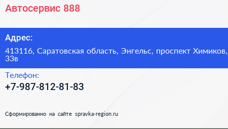 Автосервис-888 по адресу 413116, Саратовская область, Энгельс, проспект Химиков, 33в в дальнейшем Организация, размещена в следующих категориях: