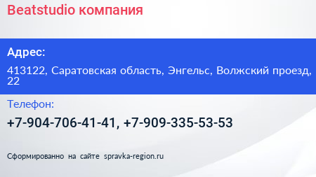 Beatstudio, компания по адресу 413122, Саратовская область, Энгельс, Волжский проезд, 22 в дальнейшем Организация, размещена в следующих категориях:
