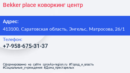 Bekker-place, коворкинг-центр по адресу 413100, Саратовская область, Энгельс, Матросова, 26/1 в дальнейшем Организация, размещена в следующих категориях: