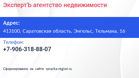 ЭкспертЪ, агентство недвижимости по адресу 413100, Саратовская область, Энгельс, Тельмана, 16 в дальнейшем Организация, размещена в следующих категориях: