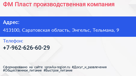 ФМ Пласт, производственная компания по адресу 413100, Саратовская область, Энгельс, Тельмана, 9 в дальнейшем Организация, размещена в следующих категориях:
