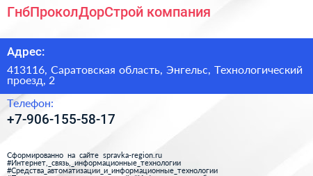 ГнбПроколДорСтрой, компания по адресу 413116, Саратовская область, Энгельс, Технологический проезд, 2 в дальнейшем Организация, размещена в следующих категориях: