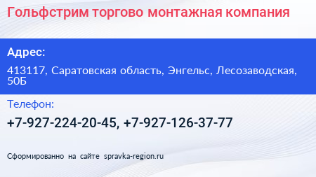 Гольфстрим, торгово-монтажная компания по адресу 413117, Саратовская область, Энгельс, Лесозаводская, 50Б в дальнейшем Организация, размещена в следующих категориях: