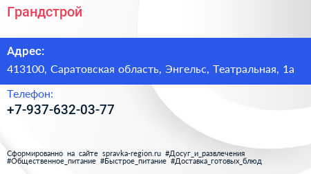 Грандстрой по адресу 413100, Саратовская область, Энгельс, Театральная, 1а в дальнейшем Организация, размещена в следующих категориях: