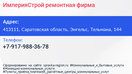 ИмперияСтрой, ремонтная фирма по адресу 413111, Саратовская область, Энгельс, Тельмана, 144 в дальнейшем Организация, размещена в следующих категориях: