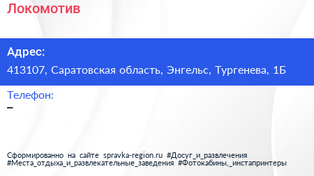 Локомотив по адресу 413107, Саратовская область, Энгельс, Тургенева, 1Б в дальнейшем Организация, размещена в следующих категориях: