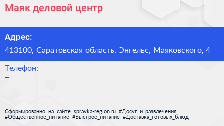 Маяк, деловой центр по адресу 413100, Саратовская область, Энгельс, Маяковского, 4 в дальнейшем Организация, размещена в следующих категориях: