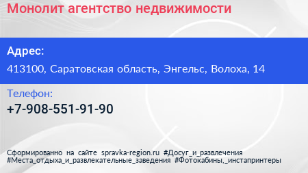Монолит, агентство недвижимости по адресу 413100, Саратовская область, Энгельс, Волоха, 14 в дальнейшем Организация, размещена в следующих категориях: