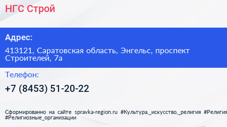 НГС Строй по адресу 413121, Саратовская область, Энгельс, проспект Строителей, 7а в дальнейшем Организация, размещена в следующих категориях: