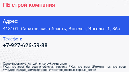 ПБ-строй, компания по адресу 413101, Саратовская область, Энгельс, Энгельс-1, 86а в дальнейшем Организация, размещена в следующих категориях: